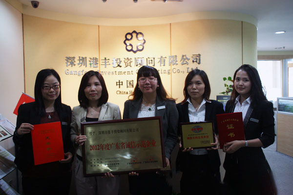 我司榮獲了“2012年廣東省誠信示范企業(yè)”榮譽稱號,成為行業(yè)內(nèi)首家獲此殊榮的企業(yè),港豐總經(jīng)理魏曉嶸和副總經(jīng)理葉惠霞授領榮譽牌匾和證書。