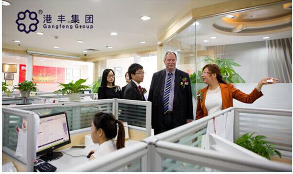 座談會后港豐集團(tuán)CEO魏曉嶸帶領(lǐng)阿聯(lián)酋哈伊馬角政府投資局董事局總經(jīng)理Mr. Peter-Michael Shuster一行參觀了港豐集團(tuán)深圳公司辦公區(qū)域。面對深圳港豐一流的辦公環(huán)境Mr. Peter-Michael Shuster感慨的說“我17年前就來過中國,今天的中國變化真是太大了,我喜歡中國,中國是一片充滿機(jī)會的熱土。也非常喜歡港豐,港豐是一個(gè)國際化品牌公司”